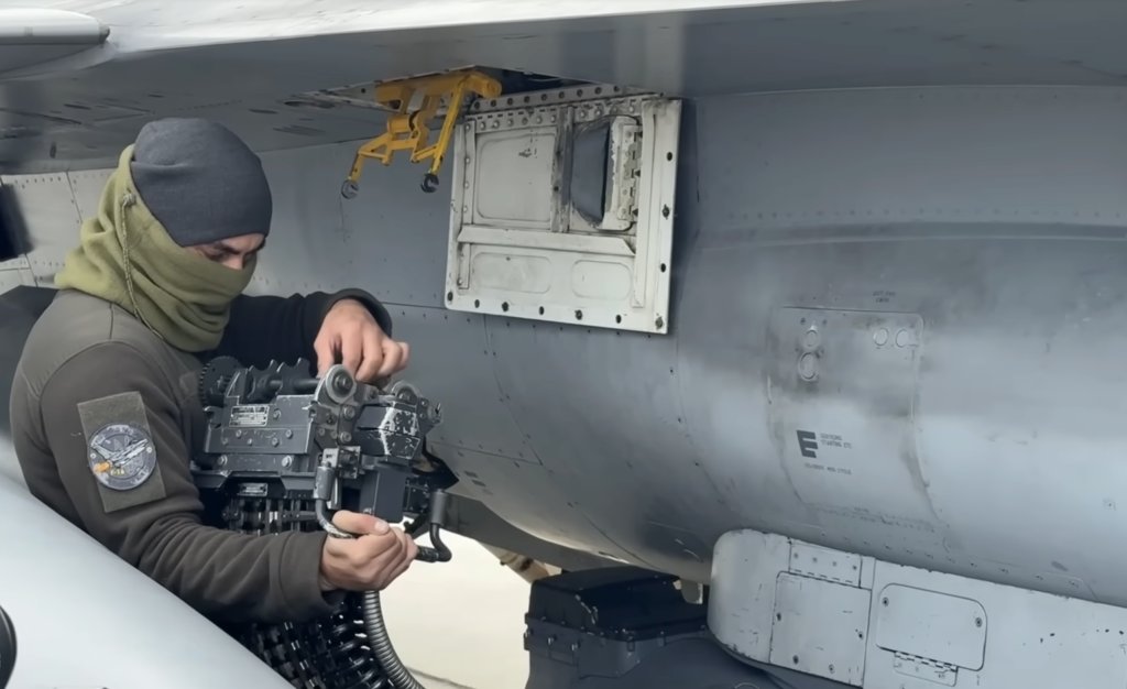 An armorer loads an F-16 with 20mm ammunition for its M61A1 cannon. Ukrainian Air Force screencap