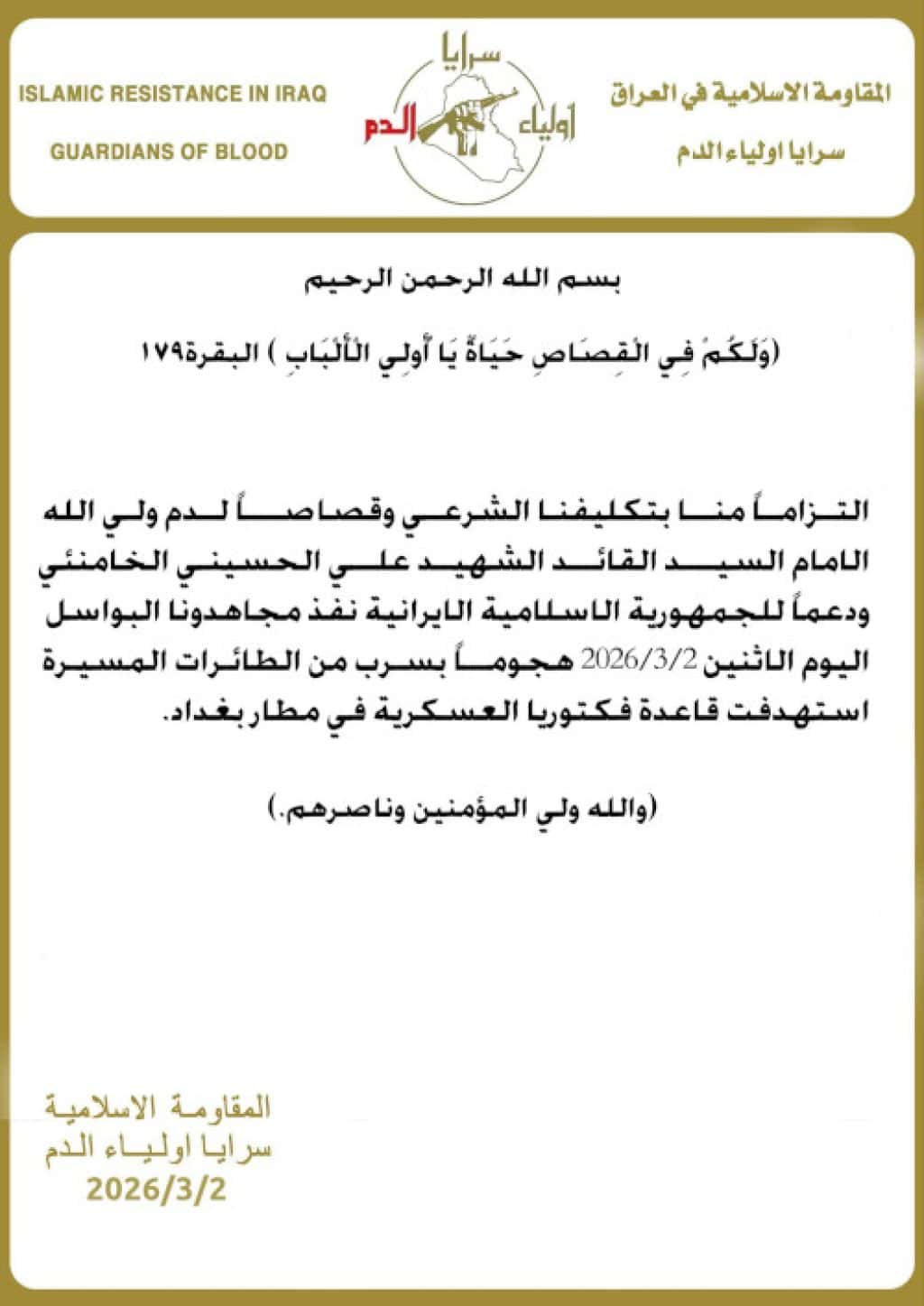 A Saraya Awliya al Dam statement claiming responsibility for attacking Camp Victoria in Iraq on March 3.