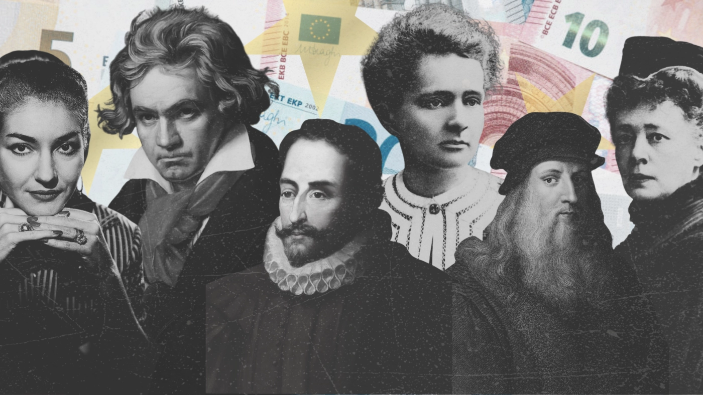Credit: Getty Images. Visual by Euractiv. The image does not represent the future design. In order: Maria Callas (€5), Ludwig van Beethoven (€10), Marie Curie (born Skłodowska) (€20), Miguel de Cervantes Saavedra (€50), Leonardo da Vinci (€100), Bertha von Suttner (€200).
