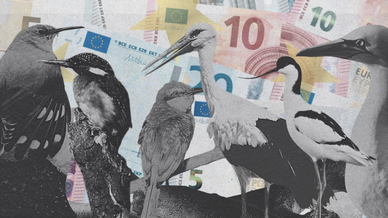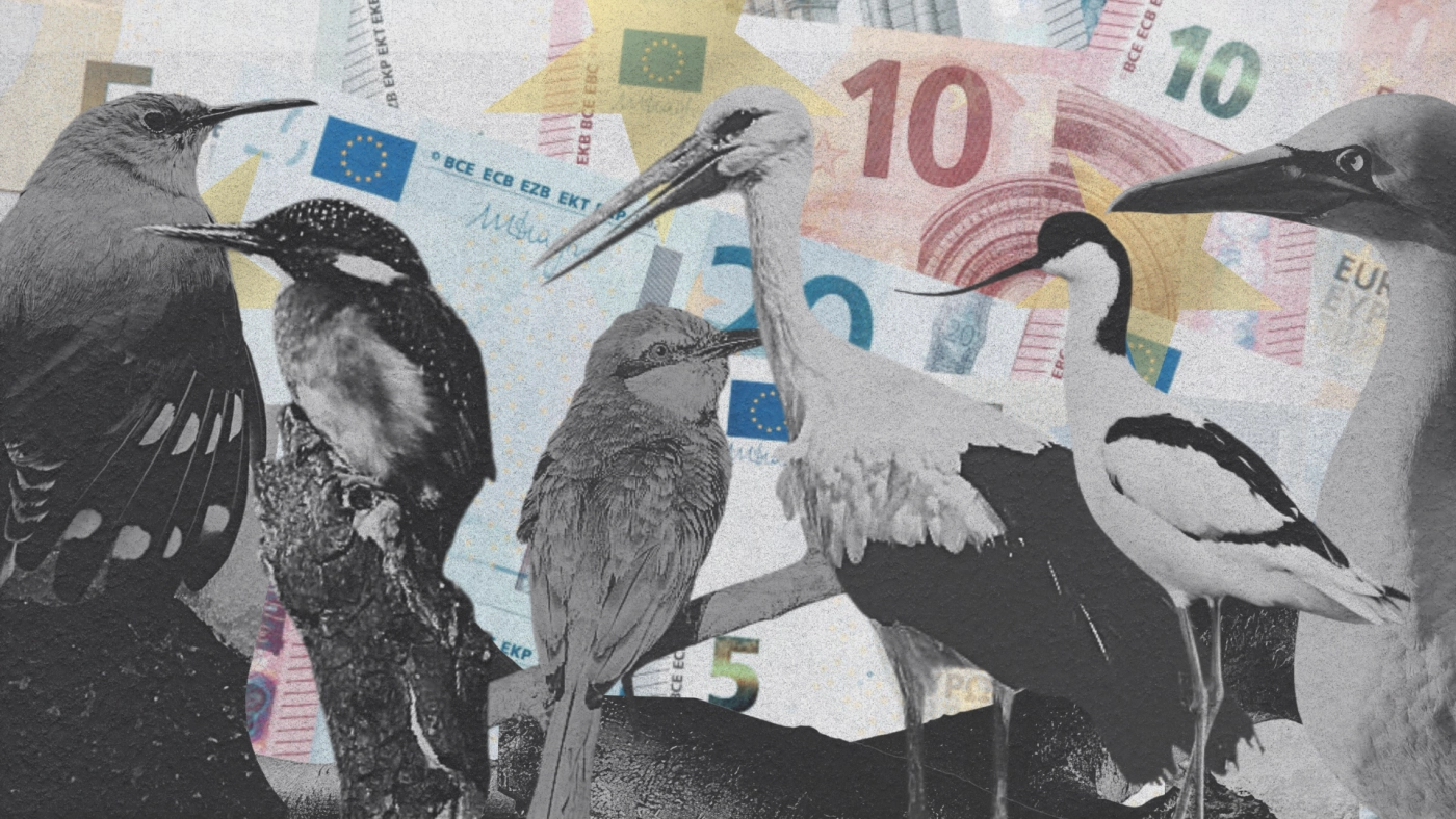 Credit: Getty Images. Visual by Euractiv. The image does not represent the future design. In order: Wallcreeper (€5), Kingfisher (€10), Bee-eater (€20), White stork (€50), Avocet (€100), Northern gannet (€200).