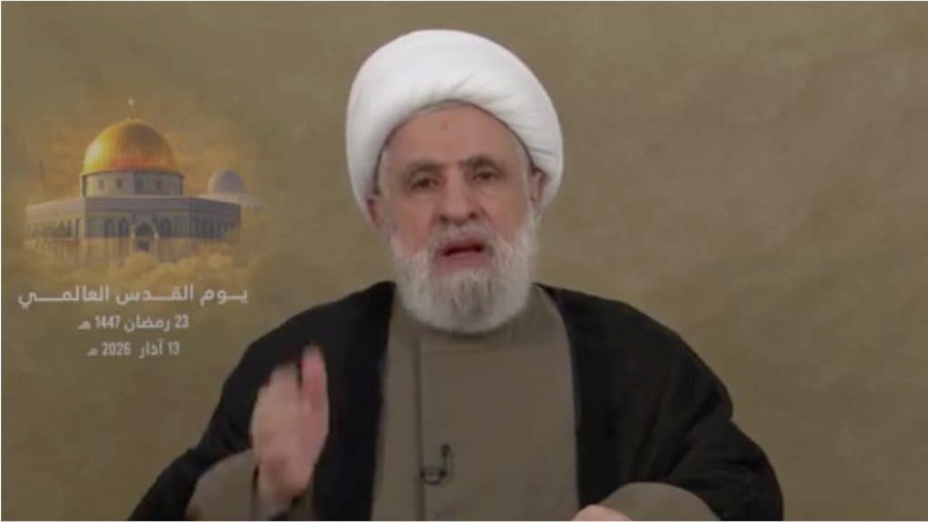 Hezbollah Secretary-General Naim Qassem during his 2026 Qods Day speech.