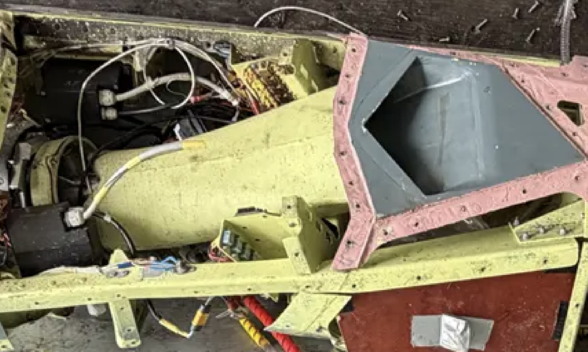 The S-71K’s airframe is made from “a multi-layer fiberglass material with additional reinforcement,” with other internal elements made of aluminum alloys. The airframe has a low-observable shape, with a trapezoidal cross section, chined nose, pop-out swept wings, and an inverted V-tail. Available imagery of the wreckage reveals details of the top-mounted conformal engine intake, feeding a pentagon-shaped intake duct. There are, however, no signs of any low-observable coatings, such as radar-absorbent material, likely to keep costs down.