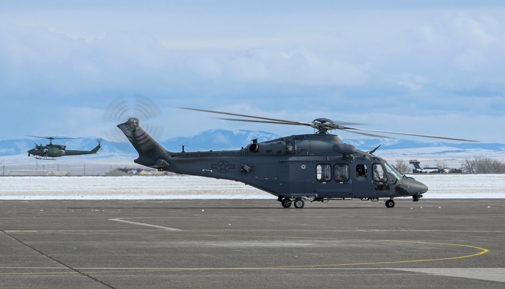 One of the US Air Force’s new MH-139A Grey Wolf helicopters. One of the service’s UH-1Ns in a configuration used to provide security around ICBM silos is seen in the background. USAF The first AFGSC MH-139A at Malmstrom Air Force Base in Montana, with a UH-1N seen flying in the background. USAF