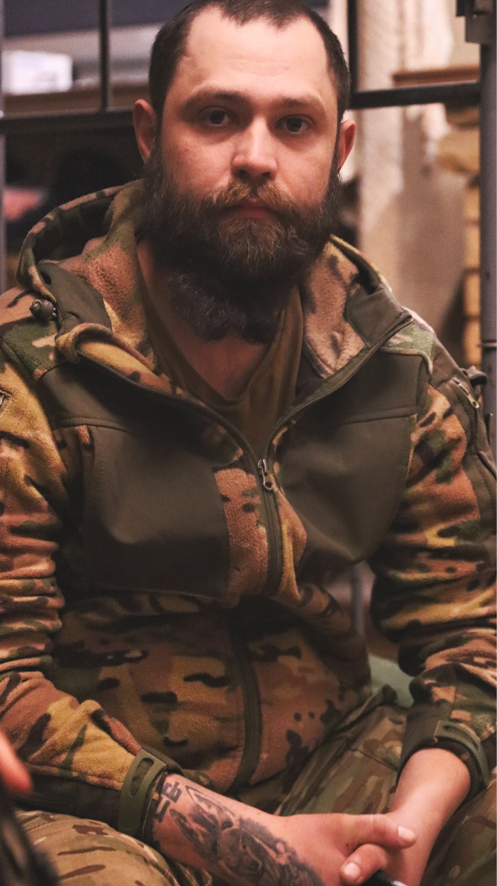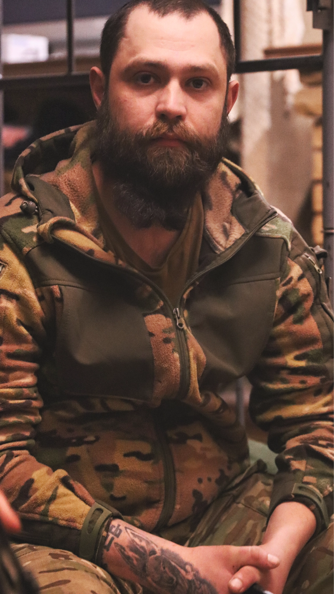 Next to him sits a bearded man, his hands resting loosely between his knees, listening more than speaking. He goes by Khor, born and raised in Dnipro, where he worked in a factory producing construction materials before joining Ukrainian forces on March 3, 2022, just one week after Russia started that war. “At that point it was already clear that there was no distance between what was happening and where we were,” he recalls from those early days.