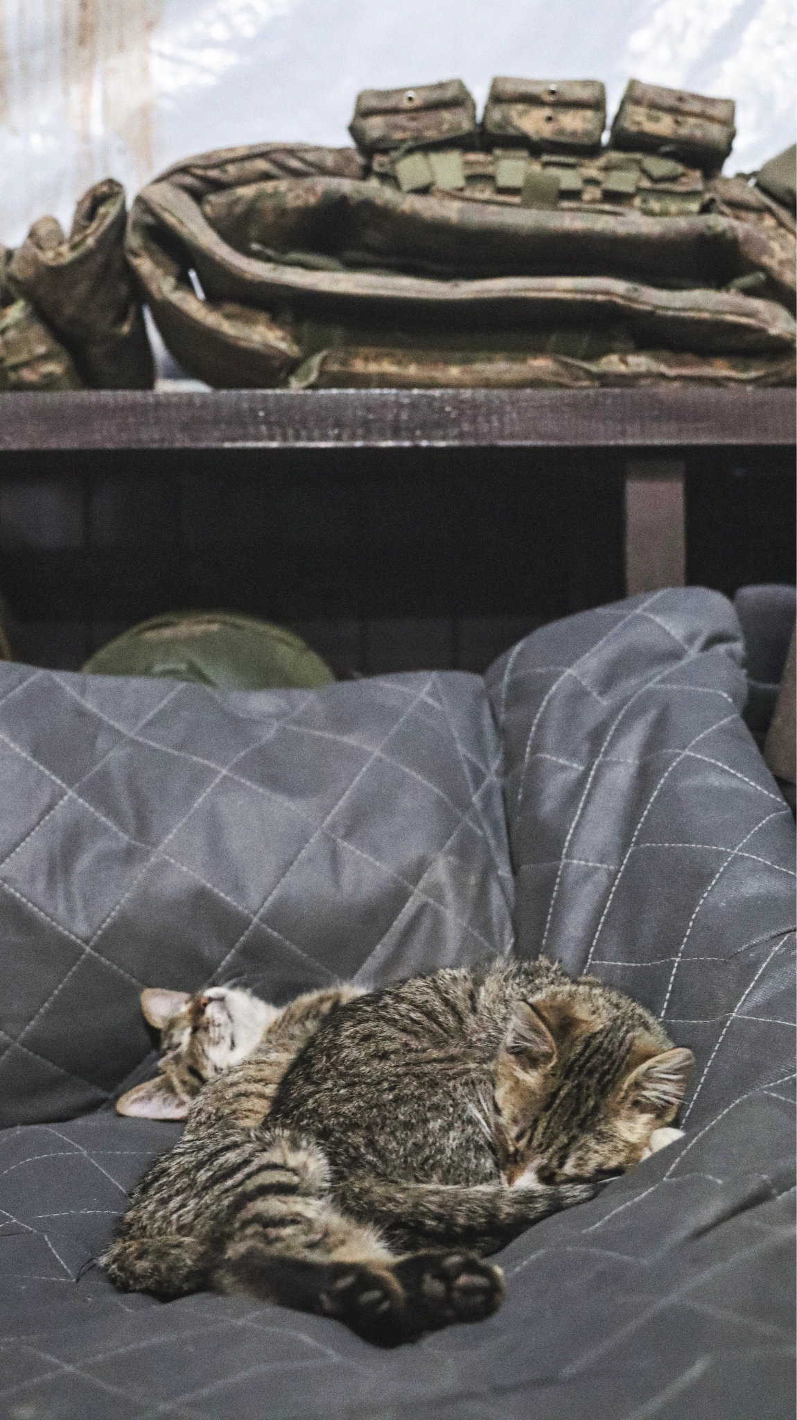 Kittens sleeping inside a rotation house used by the Khartia Brigade outside Kharkiv, April 2026. (Photo by Korbinian Leo Kramer)